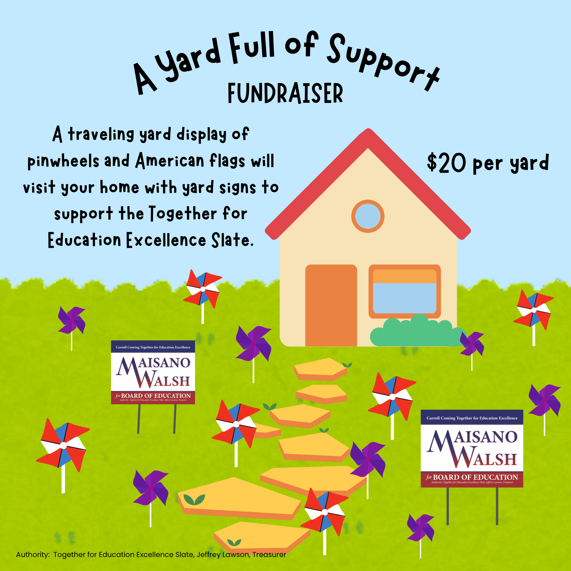 Sign up to have a traveling display of yard signs, pinwheels, and American flags visit your home! Help us spread the word and build enthusiasm for our campaign.